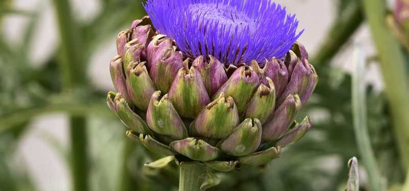 Die Blütenköpfe sind blauviolett. Noch bevor diese zu blühen beginnen, können sie geerntet und als Gemüse zubereitet werden. Auch sind die Blütenköpfe sehr beliebt als Dekoration. Ursprünglich stammt die Artischocke aus dem Mittelmeergebiet.